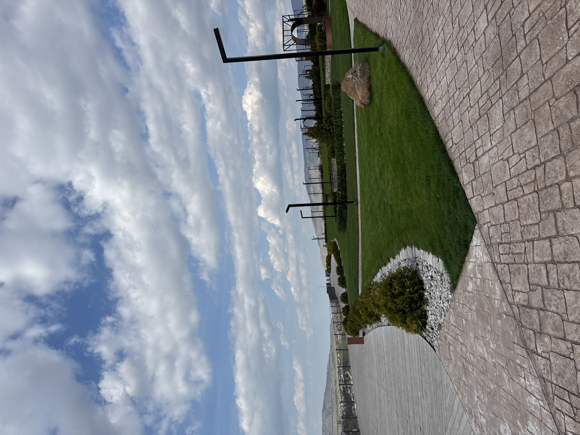 The image depicts a park landscape in Novo-Zubutli, Russia, under a sky filled with scattered white clouds and patches of blue. A paved walkway with a block pattern extends along the right side of the frame. Adjacent to the walkway is a strip of green lawn containing a large rock. Black metal lighting fixtures are spaced along the lawn's edge. A line of trimmed shrubs with white stone surrounds a lower, lighter-colored walkway. A distant view of the city and surrounding mountains is visible in the background.