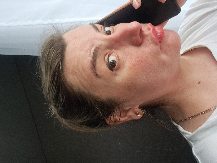The image captures a close-up, chest-up portrait of an adult female in an indoor setting. The subject has fair skin exhibiting some redness and visible pores/freckles. Her brownish-blonde hair is pulled back, with individual wispy strands visible around her forehead. She has dark, lined eyes with eyeliner and a prominent nose. Her lips are pursed into a pout, directed towards the viewer. She is wearing a white crew-neck t-shirt and a thin gold-colored chain necklace. A gold-toned, abstractly shaped earring is visible in her left ear. Her right hand holds a dark-colored smartphone, featuring a light-colored bezel, against her right cheek, partially obscuring her mouth. Her fingernails are painted with a light-colored polish. The background consists of a dark, uniform surface on the left and a white, translucent fabric, likely a curtain or sheer blind near a window, on the right. The lighting is soft and diffuse, originating predominantly from the right side of the frame. The indoor scene is situated in the city of Saransk, Russia.