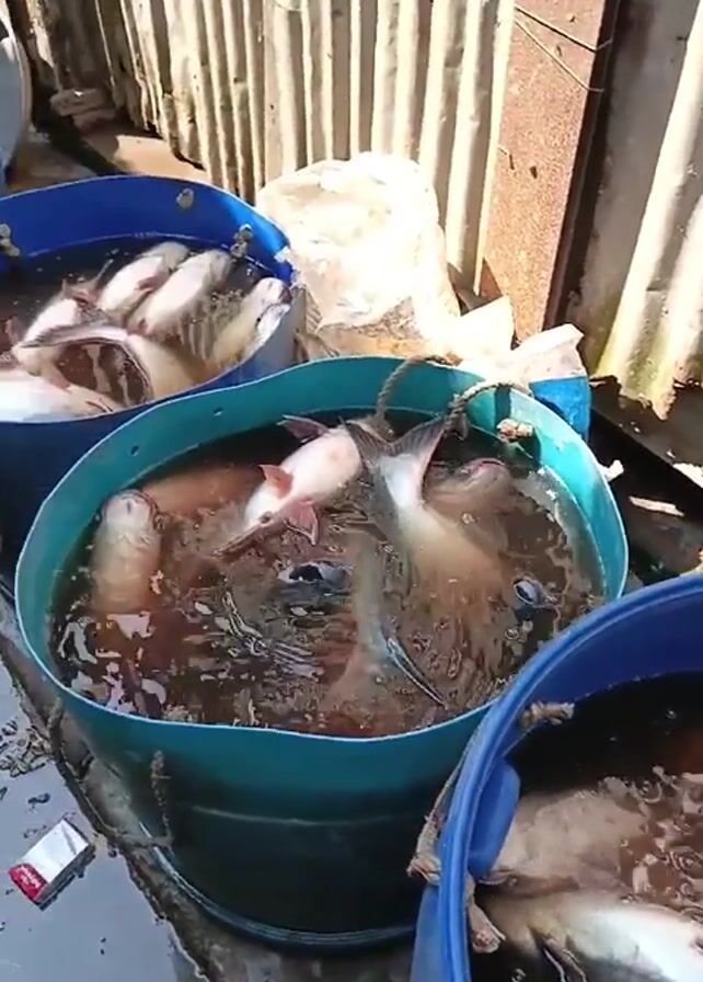 n outdoor fish market. Several blue plastic buckets filled with water and fish are visible. People walk by in the narrow market, with stalls under a corrugated metal roof. The ground is wet. The scene appears to be in a lower-income neighborhood.