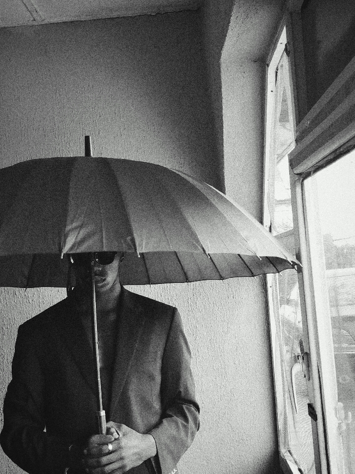 An indoor, monochromatic photograph taken in Sabon Tasha, Nigeria, depicts an individual from the mid-torso up. The subject, an adult male, is positioned centrally, holding an open, dark-colored umbrella vertically. The umbrella's canopy obscures the upper portion of his head and face, with only his nose and lips visible above the umbrella handle. He wears dark sunglasses and an unbuttoned blazer, revealing no shirt underneath. A plain band ring is on the ring finger of his left hand, which grips the umbrella's shaft. The background features a textured, light-colored wall on the left. To the right, a window frame with partially visible venetian blinds or shutters shows an indistinct exterior view. The ceiling is also textured and visible at the top of the frame. The image exhibits a noticeable grain.