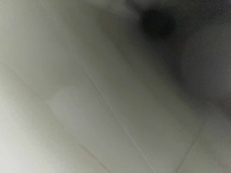 An angled view of a white or light gray ceiling dominates the scene. The surface exhibits uneven textures with visible seams or cracks running diagonally. To the upper right, a dark, blurred area suggests a shadow or a portion of a fixture. The lighting is diffused, casting a soft glow on the ceiling and highlighting the variations in the surface. A couple of brownish spots are also discernible in the lower-left area, potentially indicating stains or imperfections.