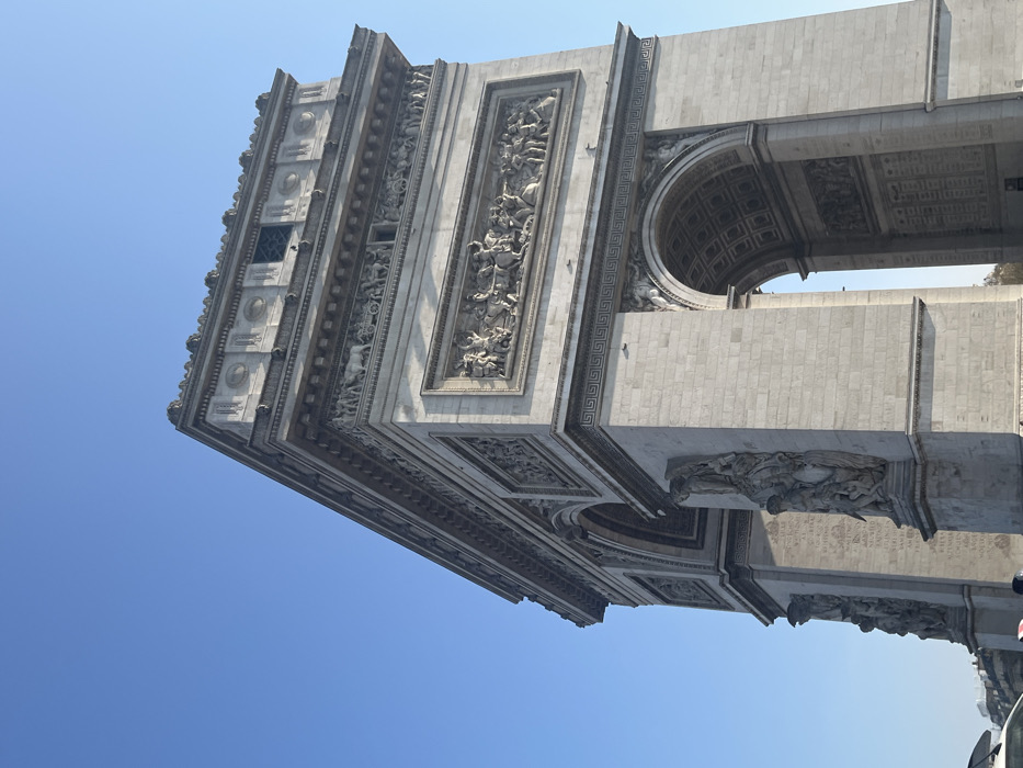 - "The image displays a monumental Neoclassical triumphal arch constructed from light-colored stone, viewed from a low angle looking upwards against a clear, unblemished blue sky" by FM-WnOQx1, licensed under CC BY 4.0