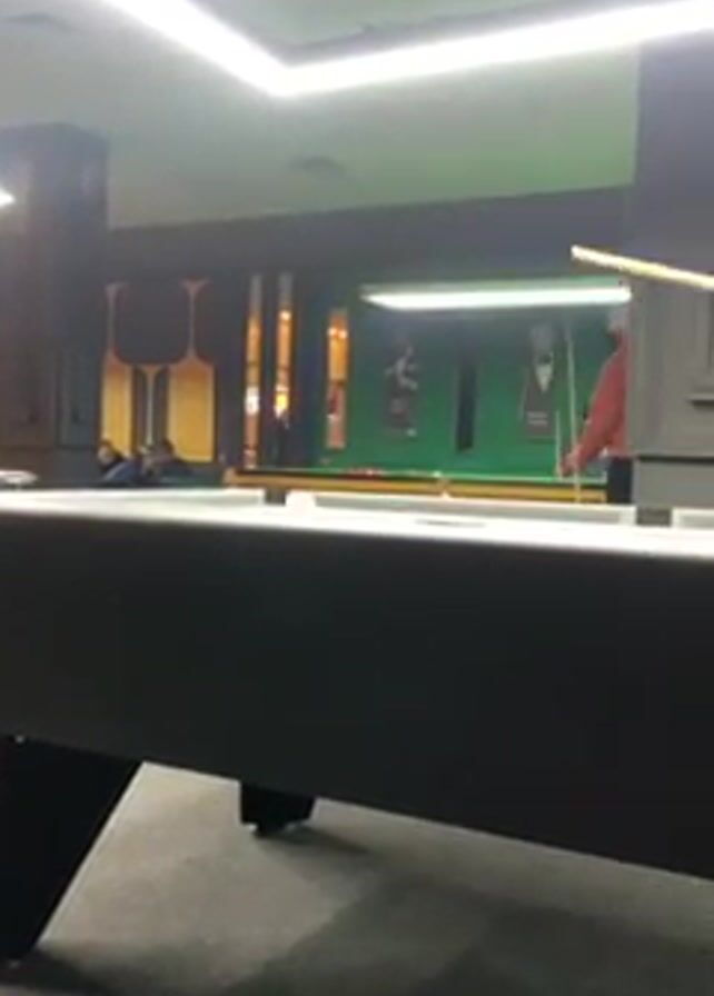 n indoor setting, specifically a billiard room. The room has a black billiard table with a red ball on it. Two people are playing snooker on the other table in the back. In the foreground, a person in a red hooded jacket is standing near the billiard table. The person strikes the white ball and moves back. Another man wearing a black jacket with the hood on takes the cue and appears to be preparing to play. The room is lit with overhead fluorescent lights, and the walls have decorative elements. Other people are present in the room, seen in the background.