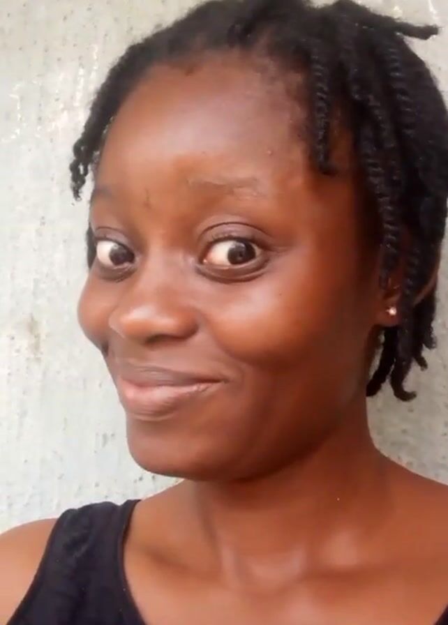 A young, brown-skinned woman with dark, short, twisted hair stands in front of a textured, off-white wall. She is wearing a black tank top. She makes a series of funny faces, including widening her eyes, looking up, and smiling.