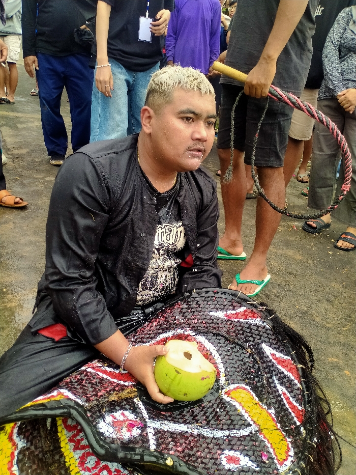 The image depicts an outdoor scene in Ganten, Indonesia. A man is seated in the foreground, positioned on a large, intricately decorated Kuda Lumping (Jathilan) horse head prop. The man has short, bleached blonde hair, a mustache, and is wearing a wet black long-sleeved shirt unbuttoned over a black graphic t-shirt, paired with dark pants. His face and clothing appear saturated with water, and a white, foamy substance is visible around his mouth. He holds a green, partially opened young coconut in his right hand. To his immediate right, a partially visible individual holds a whip constructed with a light wooden handle and a braided black and red rope lash. Several other individuals are present in the blurred background, standing on a wet, grey paved surface. They are dressed in various casual attire, including long pants, shorts, and flip-flops.