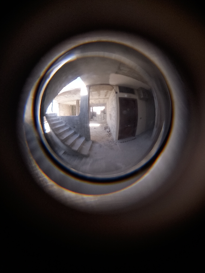 - "The image displays a fisheye-lens view, as if through a peephole, of an unfinished interior space within a building in Mu'adammiyat ash-Sham, Syria" by FM-6eLZi2, licensed under CC BY 4.0