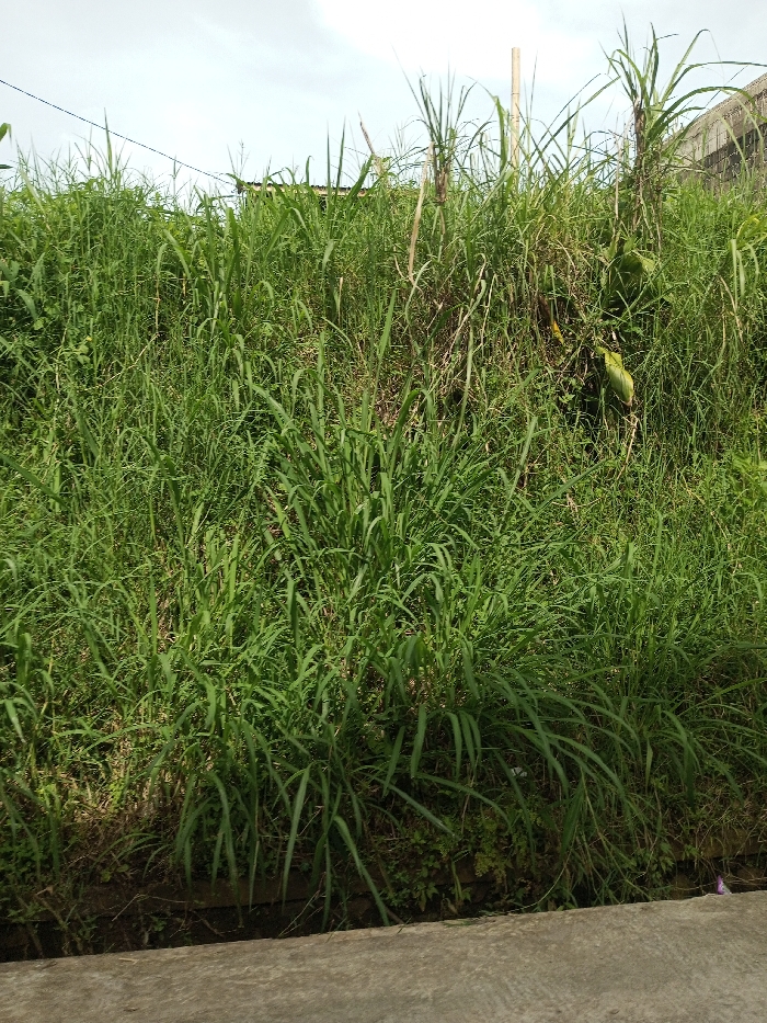 This image displays a dense, uncultivated expanse of green vegetation located in Kandenuwara, Sri Lanka. A light grey concrete surface occupies the immediate foreground, running horizontally across the bottom. Immediately behind this, a thick embankment of various green grasses and weeds, some exceeding one meter in height, fills the central and mid-ground. Interspersed within this dense foliage are several broader-leaved plants. A thin, vertical, light-colored pole is visible within the vegetation towards the upper right-center. The background reveals an overcast sky above the vegetation line. A dark, thin horizontal wire, consistent with a utility line, traverses the upper left quadrant. A segment of a light-colored structure, possibly a building wall or fence, is partially discernible above the vegetation on the far right. No individuals or discernible actions are depicted.