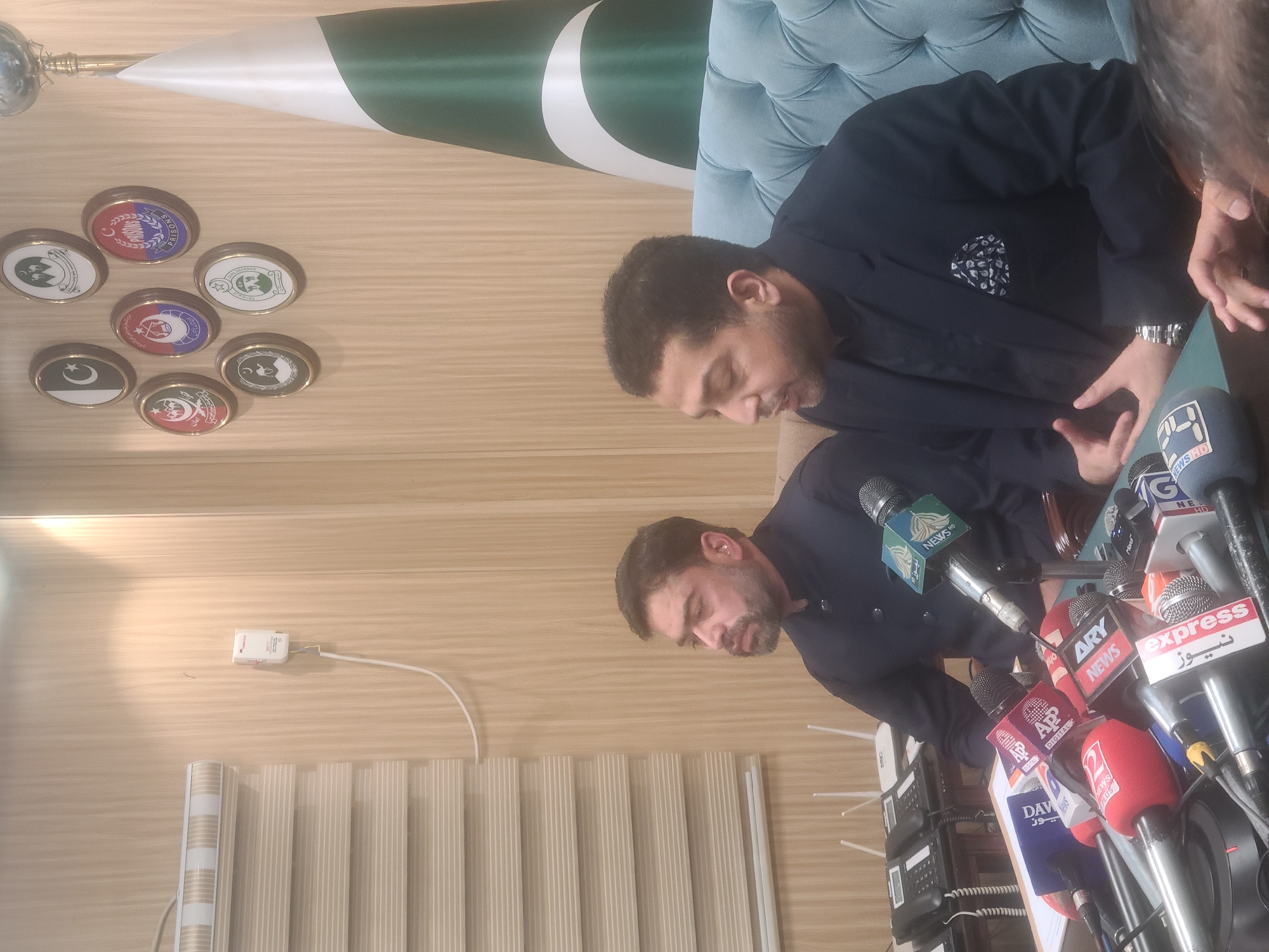 two men, presumably politicians, sitting in front of a bank of microphones, likely giving a press conference. A Pakistan flag is displayed in the background, along with a wall decorated with several circular emblems. The microphones are from various news outlets, including "24 NEWS HD," "ARY NEWS," "Express News," and "DAWN News." The setting appears to be indoors, with blinds visible in the background, along with a wall power outlet and a beige wall. The location is likely in Pakistan, given the flag and the various news outlets broadcasting in Urdu or English, such as in Quetta City Tehsil.