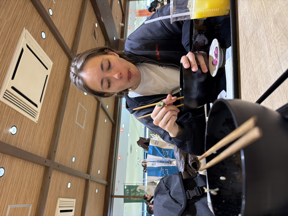 An adult female is depicted eating in a food establishment at New Chitose Airport, Chitose, Japan