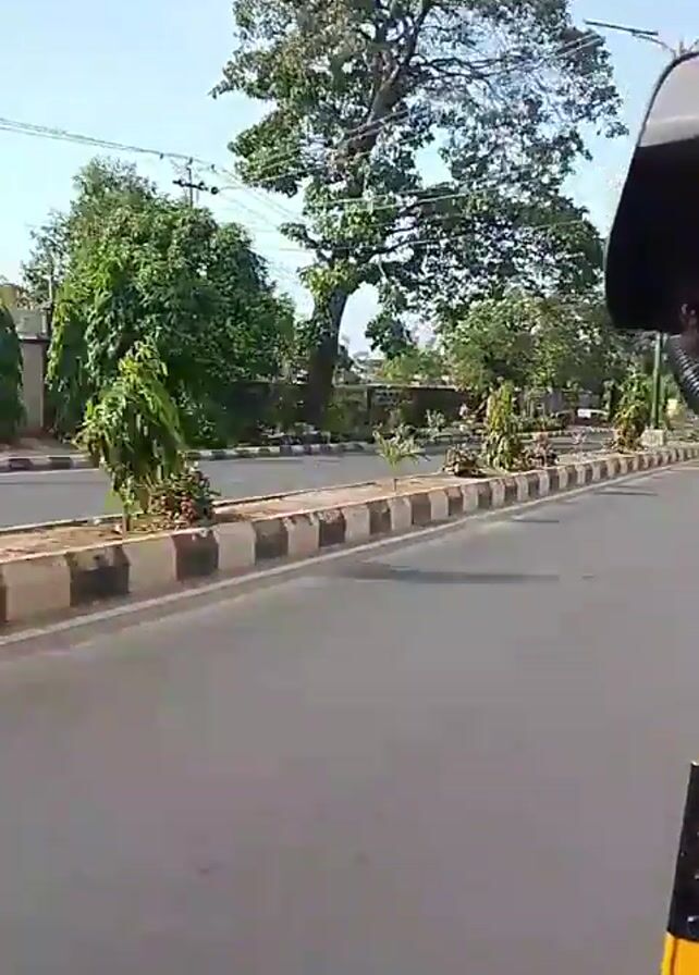 A video taken from inside a moving vehicle, possibly a three-wheeled auto-rickshaw, shows a straight asphalt road divided by a landscaped median strip