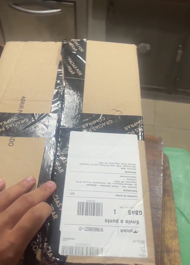 A person receives a cardboard box from an online order. The box is secured with black tape that says, “Gracias por Comprar.” The label on the box includes the word, “PICKIT.” The person then opens the box, which reveals it is for Nike. The box appears to be empty.