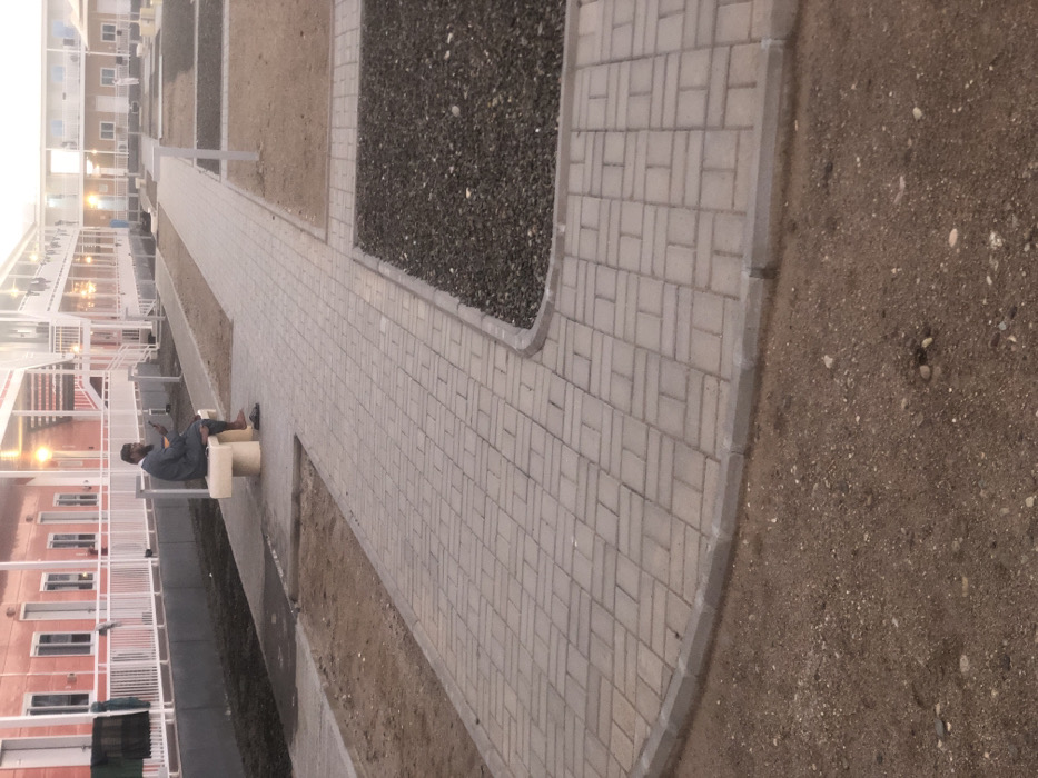 The image displays an outdoor area within a modular building complex in Hanak, Saudi Arabia, during what appears to be twilight or early morning. A single male individual, bearded and wearing a dark thobe, is seated barefoot on a light-colored concrete bench. He is actively engaged with a smartphone, holding it with both hands and looking at its screen. A pair of dark sandals rests on the ground next to his left foot. The environment features paved walkways constructed from light gray rectangular pavers laid in a repeating pattern. These paths are bordered by concrete curbs, beyond which lies reddish-brown sandy soil and rectangular sections filled with dark gravel. In the background, multiple two-story modular buildings are visible. These structures feature orange-red and white paneling, white balcony railings, and external white staircases. Clothes are seen hanging on some balcony railings. Several pole-mounted outdoor light fixtures are positioned along the walkways. A faint, distant figure in white clothing is discernible near a building further into the complex on the right side.