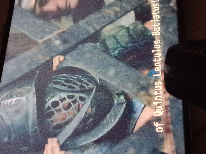 A photograph taken in Kajola, Nigeria, depicts a screen displaying a visual scene, characterized by noticeable pixelation and glare. The primary subject on the screen is an individual wearing a dark, ornate ancient Roman gladiator helmet, featuring a distinct barred faceguard through which portions of their face, including eyes and nose, are visible. Two hands are positioned near the sides of the helmet. To the right, a second individual wearing a simpler metal helmet or headwear is partially visible, showing their right eye and nose. A dark, vertical structural element, resembling a wooden beam, is present in the background of the displayed content. White text overlays the bottom of the screen, reading "of Quintus Lentulus Batiatus!". A dark, irregularly shaped object from the foreground partially obstructs the lower center of the screen, covering a portion of the displayed text.