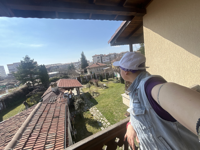 An individual is depicted standing on a wooden balcony overlooking a residential area in Karlovo, Bulgaria, under a clear, bright blue sky