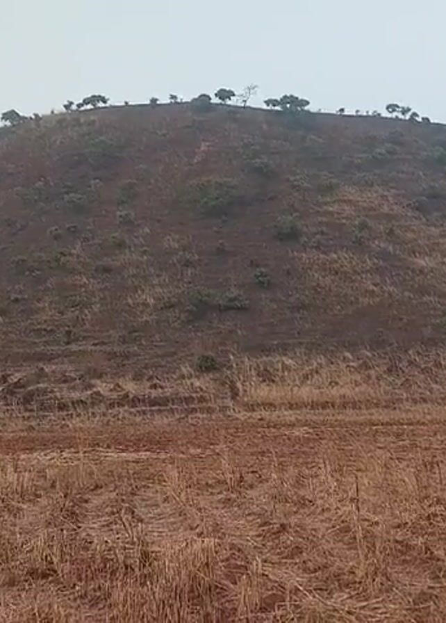 brown, dome-shaped hill covered with sparse brown vegetation and a few small trees near the top and on the sides