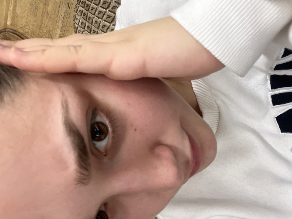 An overhead, close-up photograph depicts a young individual with fair skin, dark brown eyes, and dark brown eyebrows, looking downwards and to the viewer's left