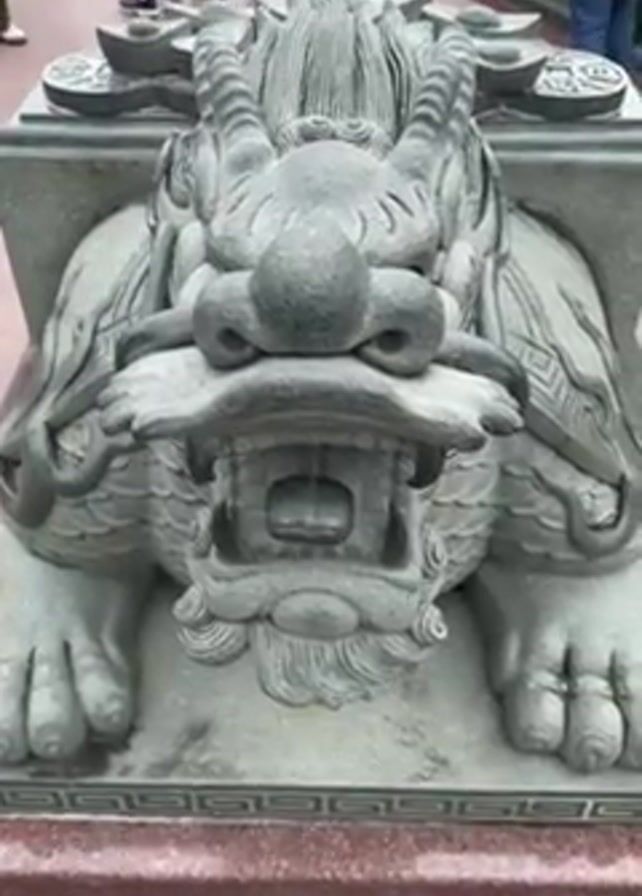 close-up of a stone dragon statue with its mouth open, revealing its teeth