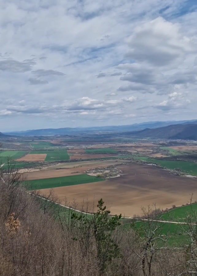 panoramic view of a valley from a high vantage point. The foreground is framed by bare trees with some green vegetation emerging, suggesting early spring. The landscape stretches out to a broad valley composed of agricultural fields in various shades of green and brown, indicating different crops or stages of cultivation. A road meanders through the valley. In the distance, a mountain range is visible, with some peaks capped with snow. The sky is partially cloudy, with patches of blue sky peeking through. A blue railing is visible at the edge of the frame in the lower right corner, suggesting that the viewpoint is a man-made structure. There are no people visible in the video.