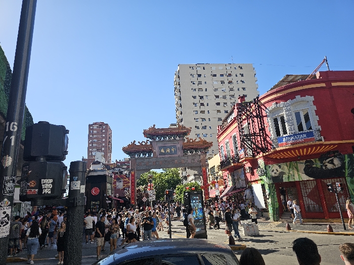 A bustling street scene features a Chinese gate, adorned with traditional architectural details, marking an entrance to a vibrant area