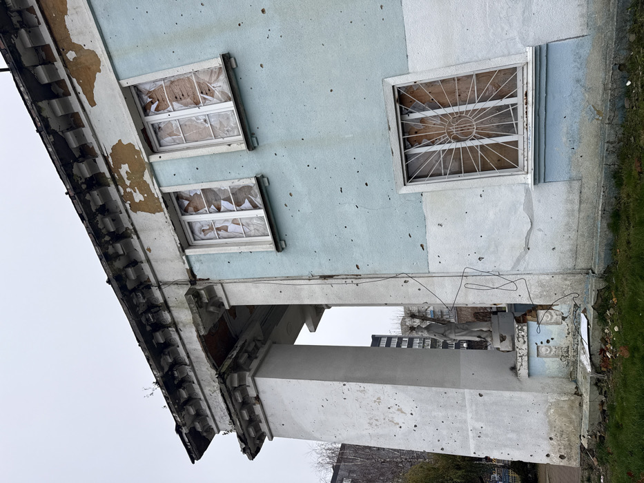 An exterior view shows a two-story building in Irpin, Ukraine, displaying significant damage