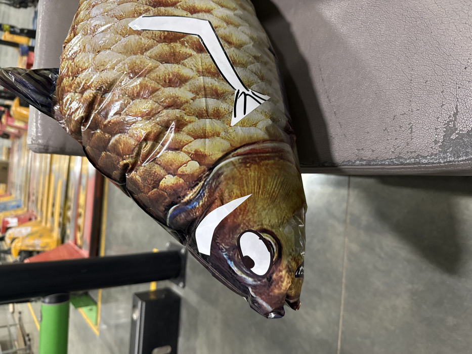 In Lupanovo, Russia, an industrial environment, a large, inflated or plastic-wrapped object resembling a carp or similar scaled fish is positioned horizontally on a worn, light grey upholstered surface. The fish object exhibits realistic brown and gold scale patterns, a dark dorsal fin, and white graphic outlines denoting pectoral fins. Its head, oriented towards the left, features a cartoonish eye with a prominent white pupil and a small, open mouth. The background consists of a dark grey industrial floor with lighter markings, a black vertical support column, and a black rectangular object to its left. Further in the unfocused background, several yellow pallet jacks with red components are arranged in a linear formation. Overhead lighting casts shadows beneath the fish object and on the floor.