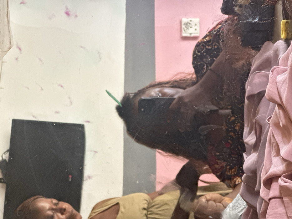 The image depicts a mirror reflection of an indoor scene in Karum, Nigeria