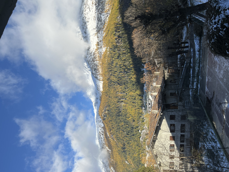 The image depicts a panoramic view of the La Thuile valley in Italy, observed from an elevated position. The upper portion of the frame features a bright blue sky with scattered cumulus clouds, some of which partially obscure the snow-capped mountain peaks in the background. Below the snowline, the mountains are densely covered with coniferous trees, predominantly showing vibrant golden-yellow autumn foliage, indicative of larch trees, with some darker green sections. A sharp diagonal shadow line extends across the middle slopes of the forested mountain. In the mid-ground, a cluster of buildings characteristic of a mountain village is visible. A prominent, light-colored building with a multi-gabled terracotta-tiled roof and multiple chimneys occupies the left-center. Its walls are light grey, and several windows with dark wooden shutters are visible, some closed, some partially open. Portions of this building and its surroundings are cast in shadow. Further back, additional buildings with similar architectural styles are interspersed among trees. The immediate foreground features a partially snow-covered environment. A tennis court, distinguished by its dark surface and white lines, is visible in the lower-center, with patches of snow and what appears to be ice. A net post is discernible on the left side of the court. Bare deciduous trees and bushes, also partially covered in snow, frame the tennis court and the buildings. No individuals are present, and no actions or interactions are depicted.