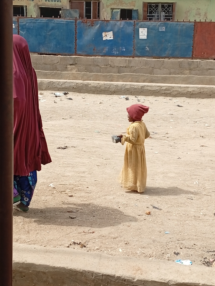 The scene depicts an unpaved, dusty area in Gwagwarwa, Nigeria, under bright daylight. In the left foreground, partially obscured by a vertical brown object, is a person wearing a flowing, deep red garment over blue and white patterned trousers, with a green shoe visible on the left foot. To their right, a young child, approximately 3-5 years old, stands centrally, dressed in a long, light yellow robe and a red head covering. The child holds a small, dark-colored container in their right hand and faces left, towards the other person, with a neutral expression. The ground is dirt, interspersed with small pieces of trash and debris. In the background, a large, weathered blue corrugated metal fence with red-brown supports separates the foreground from a building. Above the fence, the building exhibits faded green and yellow paint, with the word "SCHOOL" visible on its upper facade. Multiple windows, some open or broken, and one with a decorative metal grille, are visible on the building. A concrete curb runs across the lower portion of the image. Shadows are cast to the right, indicating the sun is overhead and slightly to the left.