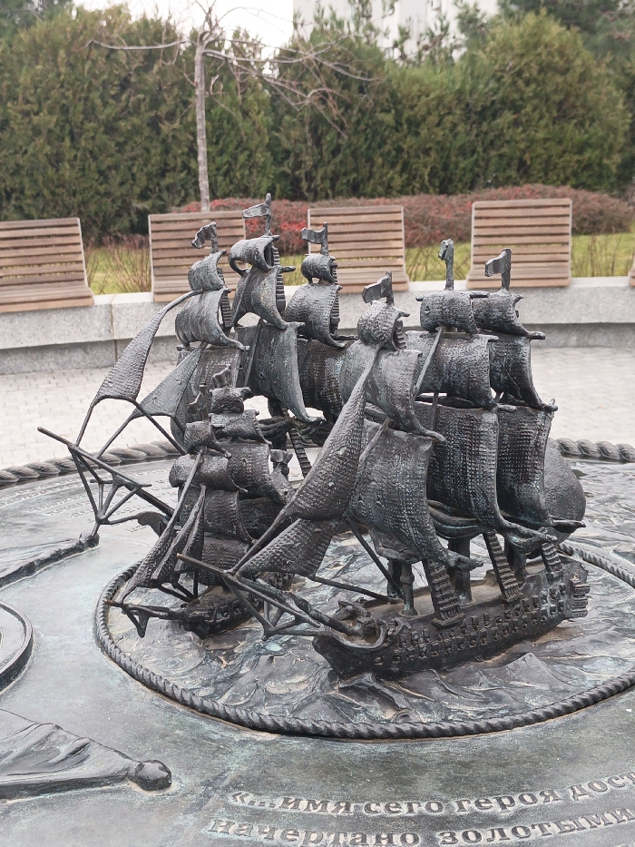 - "A bronze sculptural installation depicting a fleet of sailing ships is centrally positioned on a circular, flat bronze base within an outdoor public area in the city of Unknown, Ukraine" by FM-YVp303, licensed under CC BY 4.0