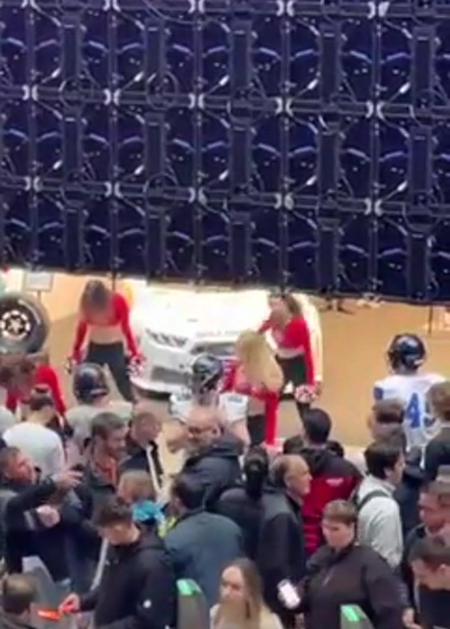 crowded indoor event with a large audience. In the background, there is a racing car and a wall of electronic panels. Four women in red outfits and black pants are dancing in front of the car. Several people in football gear are interspersed within the crowd. There are also various people wearing everyday clothing, including jackets, skirts, and sweaters. The people seem to be watching the dancers and the car display. The event takes place indoors, suggested by the artificial lighting and the building structure.