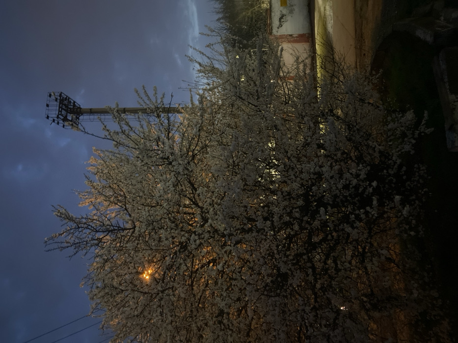 The image depicts an urban or semi-urban scene during evening or twilight in Krasnodar, Russia, under a dark blue-grey overcast sky. The primary subject is a large, deciduous tree positioned prominently in the foreground and midground, covered in dense white blossoms. An artificial light source, casting a warm orange glow, is partially visible within the tree's foliage on the left side, illuminating the blossoms. In the background to the right, a tall, slender mast-like structure, likely concrete or metal, rises against the sky, featuring a metal platform and a visible ladder extending upwards. Utility lines are faintly discernible in the upper left quadrant. Further right, a weathered wall or fence segment with peeling white, grey, and reddish-brown paint is visible. The ground in the mid-distance consists of an unpaved area, potentially dirt or gravel, with sparse vegetation. No individuals or active interactions are present in the scene.