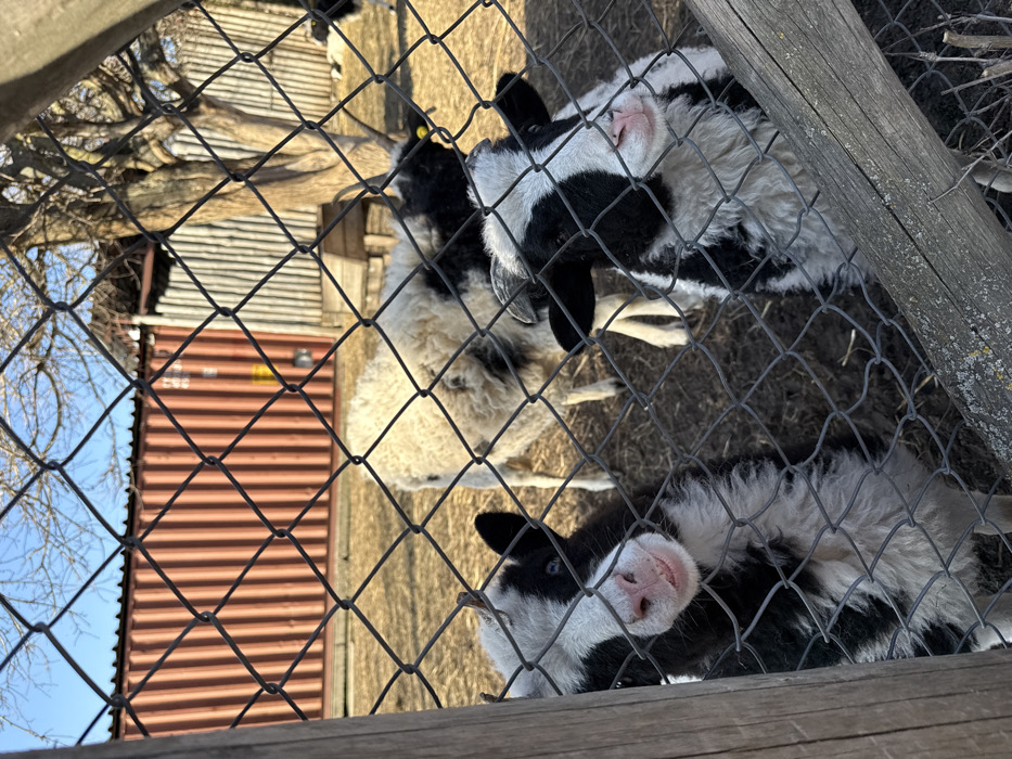 The image depicts an outdoor animal enclosure in Shakhty, Russia, viewed through a chain-link fence. In the immediate foreground, two black and white sheep or goats, characterized by their shaggy coats and distinct facial markings, directly face the camera through the wire mesh. The animal on the left displays a pink muzzle and is partially framed by a vertical wooden post. Behind these two animals, a larger, mostly white, shaggy sheep with scattered dark patches stands on dry, uneven dirt ground. A smaller, darker animal is partially visible in the far right background. The background features a large, red-orange corrugated metal container or building on the left, and a lighter, vertical corrugated metal fence or wall on the right. A bare-branched deciduous tree stands towards the right of the enclosure, adjacent to a small, low-set wooden feeder. The scene is illuminated by strong natural light under a clear blue sky.