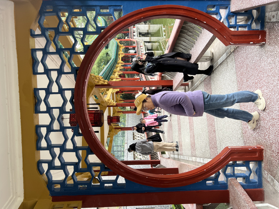 A circular architectural opening frames a scene with multiple people. A woman in a lavender jacket and jeans stands prominently within the frame, while others walk behind her. The circular structure is supported by ornate, geometric blue and white railings. The background includes traditional Chinese architecture with red lanterns and a pond. The scene evokes a sense of cultural immersion and observation.