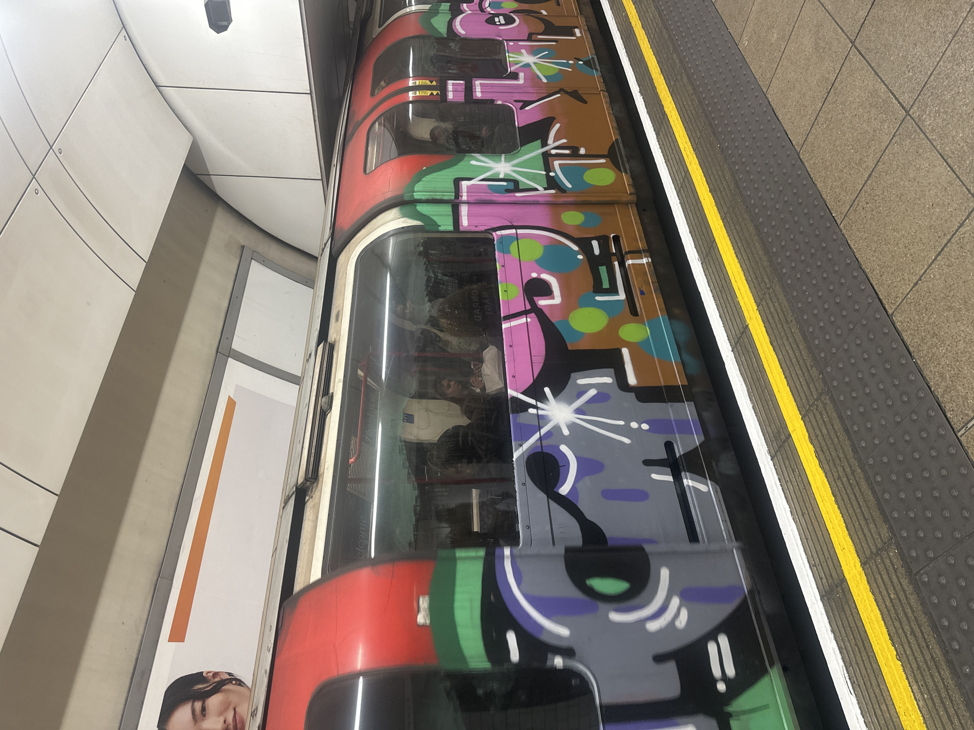 London Underground train car covered in graffiti at a station in London, United Kingdom