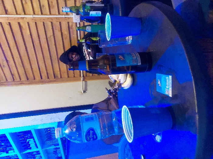 This image depicts an indoor scene within a bar or lounge in Iringa, Tanzania, characterized by dominant blue ambient lighting