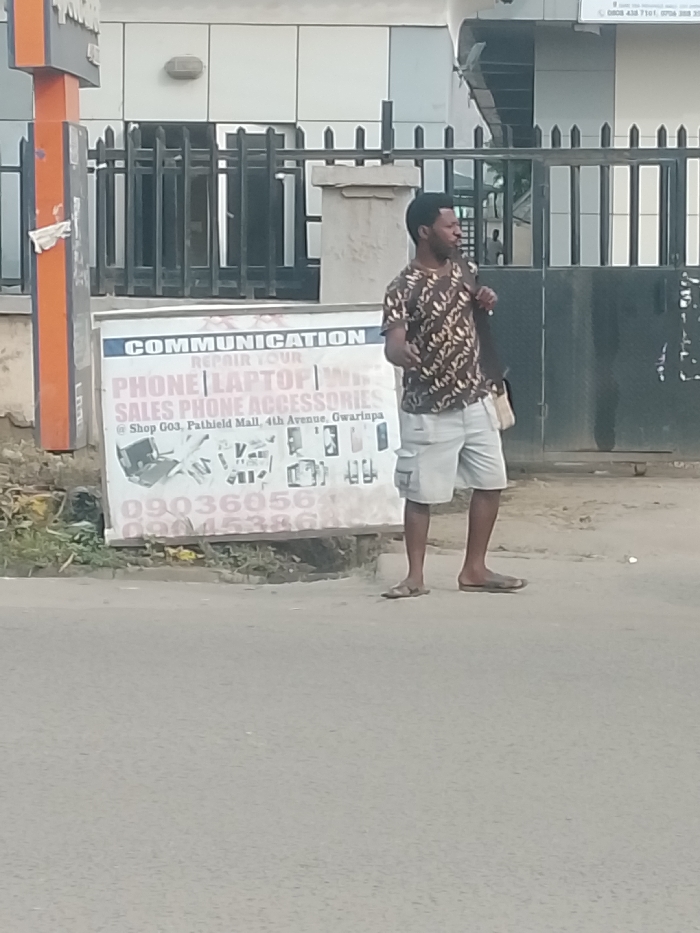 The image depicts an outdoor street scene in Gwarinpa, Nigeria, specifically near Pathfield Mall, 4th Avenue. An adult male stands on a paved road surface, facing slightly to the right of the frame with his head turned further right. He has short, dark hair, wears a brown and black patterned short-sleeved t-shirt, light-colored cargo shorts, and open-toed sandals. A light-colored shoulder bag is slung across his left shoulder, resting on his right hip. His left hand is raised and partially open, possibly in a gesture. Immediately to the male's left, a white rectangular advertisement sign stands on the ground. The sign prominently displays "COMMUNICATION REPAIR YOUR PHONE | LAPTOP | WIFI SALES PHONE ACCESSORIES" and lists the location "@ Shop G03, Pathfield Mall, 4th Avenue, Gwarinpa," along with partially visible phone numbers "09036056..." and "09045386...". Images of various electronic devices are visible on the lower portion of the sign. To the left of the sign, a patch of dirt and sparse green vegetation is visible. A tall, orange vertical pole is present on the far left side of the frame. In the background, a dark metal fence with vertical bars separates the roadside from a multi-story building. The building features a light-colored facade with dark-framed windows. A faint silhouette of another individual is visible behind the fence within the building premises. The scene is illuminated by natural light, casting subtle shadows.