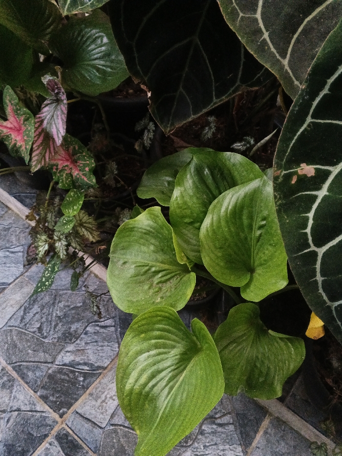 The scene, located in São Félix do Xingu, Brazil, presents an overhead view of various potted foliage plants arranged on a tiled surface. A central cluster features multiple vibrant green, heart-shaped leaves. To the upper right, a large, dark green leaf with distinct light venation is partially visible. On the left side, smaller plants display leaves with pink, red, and green variegation. Additional smaller plants with silvery-green patterned foliage are visible among the denser areas. Dark-colored plant pots are partially obscured by the foliage. The ground, visible on the left and lower-left, is composed of irregular gray and dark gray tiles with light-colored grout lines. No people, actions, or interactions are visible.
