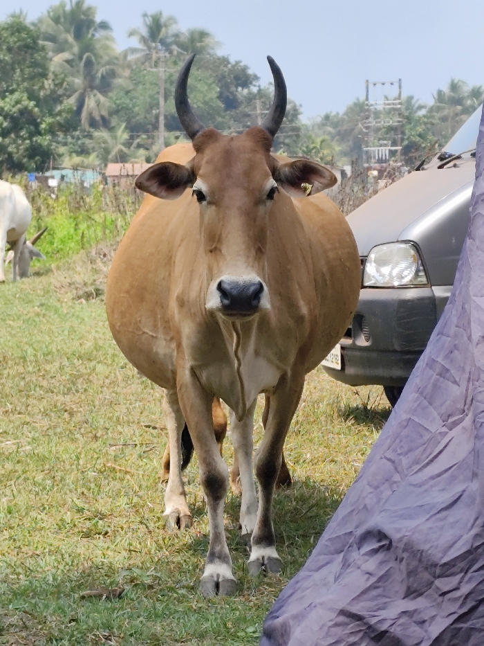 This image, taken in Querim, India, shows a light brown Zebu cow standing centrally in a grassy outdoor area, facing directly towards the viewer