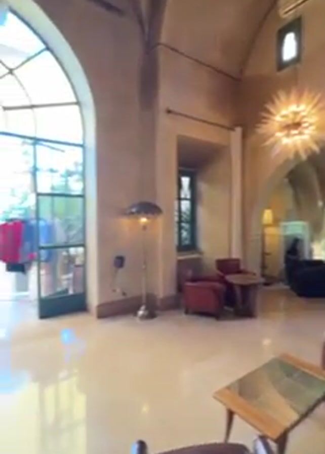 interior of a building, likely a hotel or resort. It starts with a wide shot of a spacious room with high, arched ceilings, tan walls, and a polished light-colored floor. There are several seating areas with leather armchairs and sofas, as well as coffee tables. A large, starburst-shaped chandelier hangs from the ceiling. The camera pans to show a large arched doorway leading to an outdoor area with greenery. The camera continues to move through the room, revealing more seating areas and decorative elements. It then focuses on a bright pink, lip-shaped sofa against a gray wall with a turquoise-framed window. There's also a potted plant and a wooden chest nearby. The overall impression is of a luxurious and stylish space.