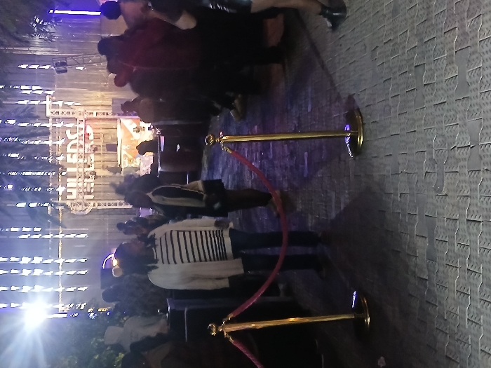 People stand behind a velvet rope barrier with brass stanchions, awaiting entry to a brightly lit event. A sign reading "UNITED ..." is visible in the background. The crowd is varied in clothing, with some wearing casual attire. The scene is busy and vibrant, suggesting a popular gathering or venue. The floor has a textured surface.