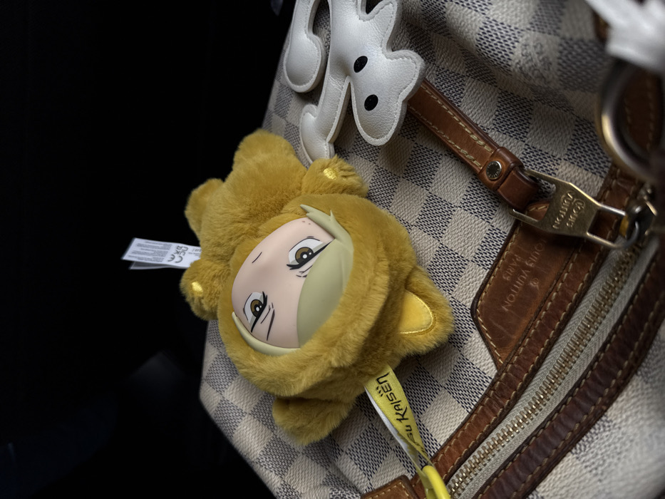 - "A yellow, furry plush toy, featuring a plastic anime-style face with brown eyes and thin eyebrows, lies on a light-colored Louis Vuitton Damier Azur patterned canvas bag" by FM-V2cLp2, licensed under CC BY 4.0
