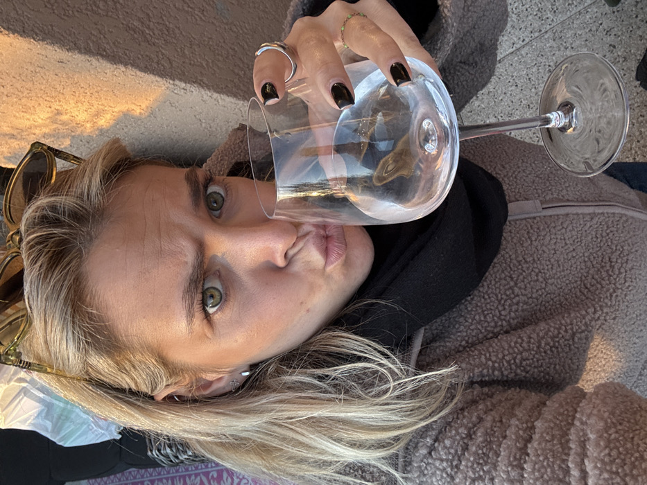 The image depicts a fair-skinned individual, likely female, with long blonde hair and green eyes, positioned to capture a selfie. She wears a light brown, textured fleece jacket over a black scarf. Sunglasses with light brown frames are perched on top of her head. Both ears feature small silver cross-shaped earrings. Her facial expression includes pursed lips and slightly furrowed eyebrows, with her gaze directed straight at the camera. Her left hand holds a clear stemmed glass, partially filled with a clear liquid. Her fingernails are painted black, and she wears a wide silver ring on her ring finger and a delicate ring with small green beads on her pinky finger. The background on the right consists of a textured, light-colored wall illuminated by warm, possibly late afternoon, sunlight. The left background is blurred, showing a purple patterned fabric and dark, indistinct shapes. The ground beneath the glass stem appears to be a light-colored, paved surface. The scene is located in the city of Marseille, France.