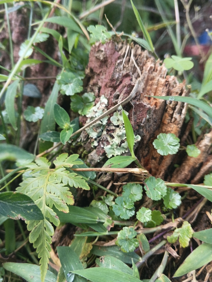 This close-up image depicts a ground-level view within the city of Quảng Ngãi, Vietnam. The central subject is a weathered, reddish-brown wooden stump or log segment, exhibiting significant decay, deep grooves, and fissures. Patches of light green and greyish lichen adhere to portions of the stump's surface. A slender, light-brown insect, camouflaged against the wood, is positioned vertically on the right side of the stump. Surrounding the decaying wood are various green plants, including multiple round-leafed ground cover plants, a distinct fern frond with segmented leaflets in the lower-left foreground, and numerous blades of grass. Several blades of grass bear small, clear water droplets. The environment appears natural, overgrown, and moist.