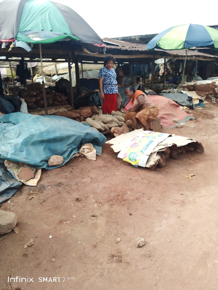 Two women are at an outdoor market, surrounded by produce. One woman stands, wearing a blue patterned shirt and red skirt, while the other sits on a small stool, wearing an orange top and patterned skirt. Large piles of yams are visible; some are uncovered, while others are beneath a blue tarp or cardboard. The market setting includes makeshift shelters with corrugated metal roofs and colorful umbrellas. The ground is dirt.