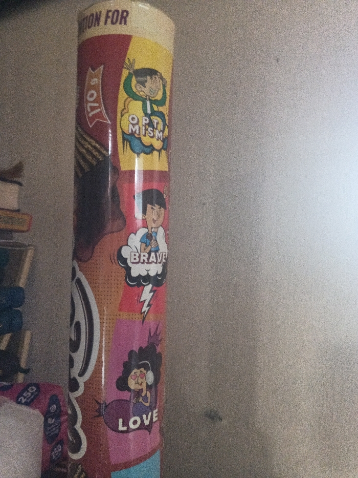 The image depicts a vertical, cylindrical object, likely a poster roll or column, positioned on the left side of the frame against a light-colored, slightly textured wall. This scene is located in Dogsenang Gorphoog, Bhutan. The cylindrical object is wrapped in a multi-paneled graphic design in a comic book or pop art style. From top to bottom, visible panels include: 1. A yellow panel featuring a cartoon figure of a person with dark hair and raised arms, smiling, above a cloud graphic containing the word "OPTIMISM". 2. A reddish-orange panel showing a cartoon figure of a person with dark hair in a light blue shirt, with one arm raised, above a cloud graphic containing the word "BRAVE". A white lightning bolt graphic is present below this. 3. A pink panel displaying a cartoon figure of a person with curly dark hair wearing headphones, holding a purple heart, with heart-shaped eyes, above the word "LOVE". To the immediate left of these panels, a dark red section of the cylinder is visible, with the text "170 G" oriented vertically. A light blue section is visible at the very bottom of the cylinder. In the blurred background on the far left, partially obscured objects are stacked, possibly books or other items, with a white item marked "250" visible at the bottom. The plain wall on the right occupies approximately two-thirds of the image, appearing brighter than the left side, suggesting a light source from the right. The overall image has a grainy texture.