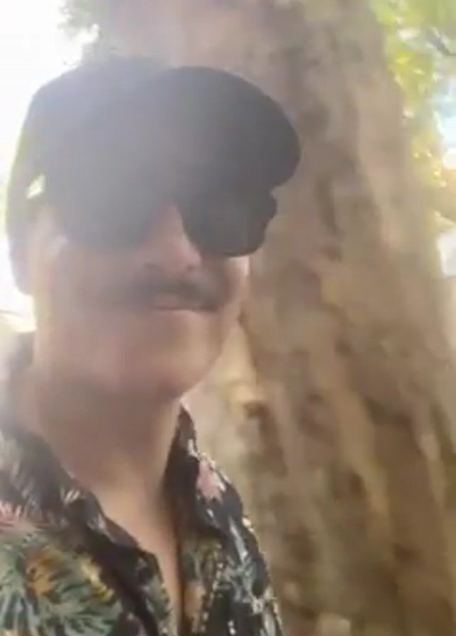 A man with a mustache, wearing a black baseball cap, sunglasses, and a colorful floral shirt, is walking down a street and recording a video. He smiles and talks to the camera. In the background, there are trees, a pink building, parked cars, and other pedestrians. The lighting appears to be daylight.