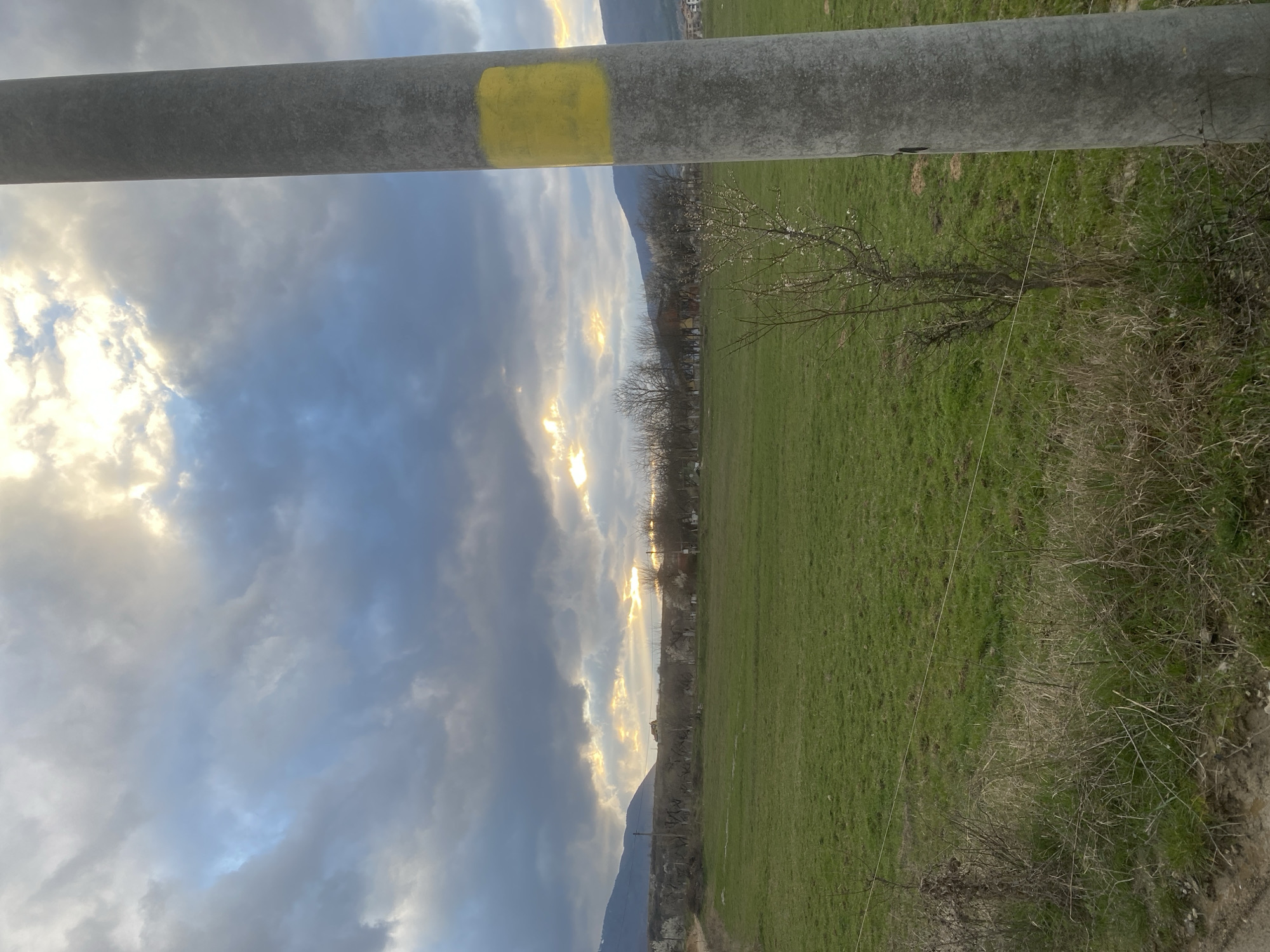 The scene, located in the city of Kyustendil, Bulgaria, presents an outdoor rural-urban transitional landscape under a heavily clouded sky. Patches of intense golden sunlight penetrate the clouds near the horizon, suggesting late day. A large, grey concrete utility pole, exhibiting surface weathering and a distinct rectangular yellow spray-painted mark, occupies the right vertical frame. The immediate foreground consists of a dirt track to the left, transitioning into areas of dry, brown vegetation and scattered green grass, bisected by a single strand of white wire fencing. A slender, leafless tree with nascent white blossoms is visible in front of the field. The mid-ground is dominated by an extensive, verdant green field. The background features a linear arrangement of deciduous trees, some in bloom with white flowers, interspersed with several light-colored buildings. A distant mountain range outlines the horizon on both sides.