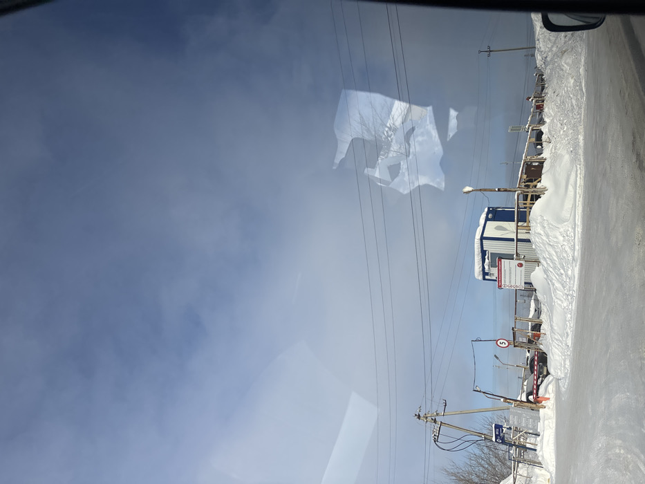 A winter scene viewed through a window. A snow-covered roadside with buildings and power lines runs along the right side. A blue sky, partly obscured by the window's reflections, fills the upper portion of the image. Snowdrifts are visible near the roadside structures. A speed limit sign is partially visible. Overall, it's a cold and possibly remote location.
