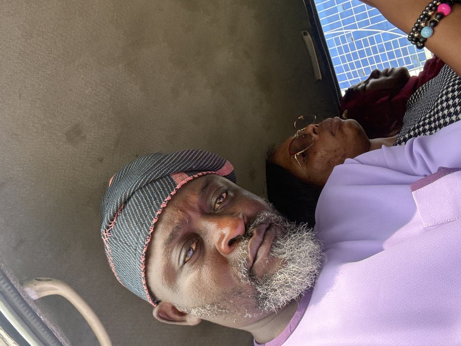 This image depicts three individuals inside a vehicle, located in Ilado, Nigeria. In the foreground, an adult male with dark skin and a grey beard wears a lavender tunic with a purple collar or trim, and a black and light blue striped cap with reddish stitching. He looks directly at the camera with a neutral expression. To his right, an adult female with dark skin and reddish-framed eyeglasses is visible, looking forward. She wears a black and white patterned garment and multiple beaded bracelets on her left wrist, including black, light blue, and pink beads. Behind her, a third individual with dark reddish hair is partially visible, also facing forward. The vehicle's interior features a beige headliner and a light-colored grab handle. Through the window on the right, a modern multi-story building with a reflective, grid-patterned glass facade is visible.
