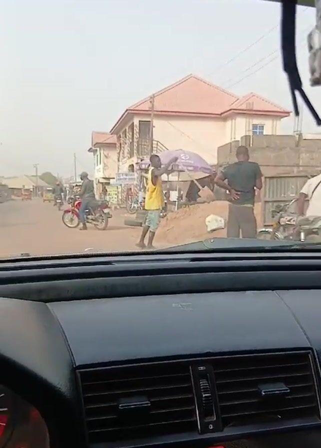 A person drives through a busy street in what appears to be a town or village. Many people are on foot and on motorcycles, and there are buildings with signs on the side of the road. A yellow tricycle vehicle is visible in the distance. The driver is wearing a large ring on their left hand. The car's dashboard is visible, along with a car freshener hanging from the rearview mirror. The air is hazy and dusty.